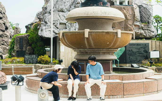源泉を使った手湯や温かいベンチ、水音が響く水琴窟などがあり、気軽に温泉気分を楽しめるスポットです。